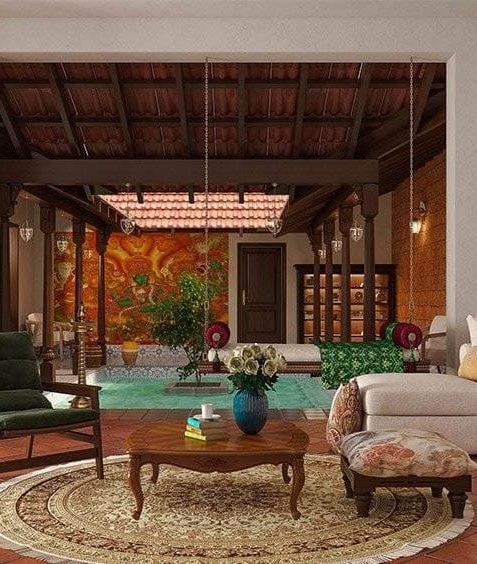 Fabrics such as silk, cotton, and linen are heavily featured, and textiles with traditional Indian patterns—like paisleys, block prints, or embroidery—are used for upholstery, curtains, and bedding. Accessories include handcrafted pottery, sculptures, and vibrant wall art, reflecting India’s diverse regional craftsmanship. Indian Traditional interiors exude a sense of spirituality, elegance, and hospitality, offering a space that feels both rooted in history and vibrantly alive.